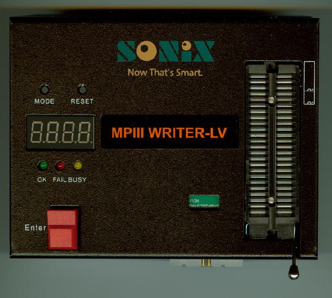 將相對應MCU型號的Writer Transition Board安插於MPIII Writer上,再將MCU放置於MPIII Writer上的Text Tool即可燒錄。